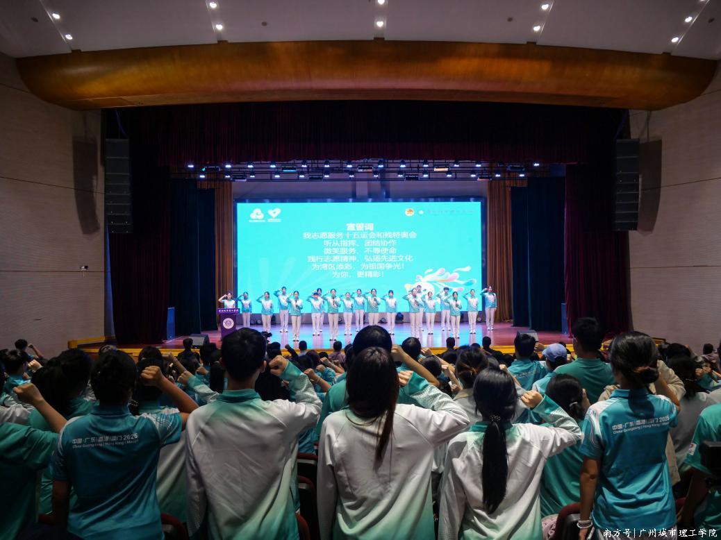 经过前期系统的通识培训,上岗服务等,广州城市理工学院志愿者已做好充分准备。电子信息工程学院/通信工程学院2022级陈董秦同学作志愿者代表发言,他回顾前期在白云机场进行的抵离服务,让他懂得了志愿者肩上的责任,志愿者的言行举止关乎赛会的整体形象,志愿者的服务质量影响着参赛人员的赛事体验。他代表全体“广州城市理工学院小海豚”承诺做到“不忘初心、牢记使命;精益求精,专业服务;团结协作,众志成城;展现风采,传递友爱。”